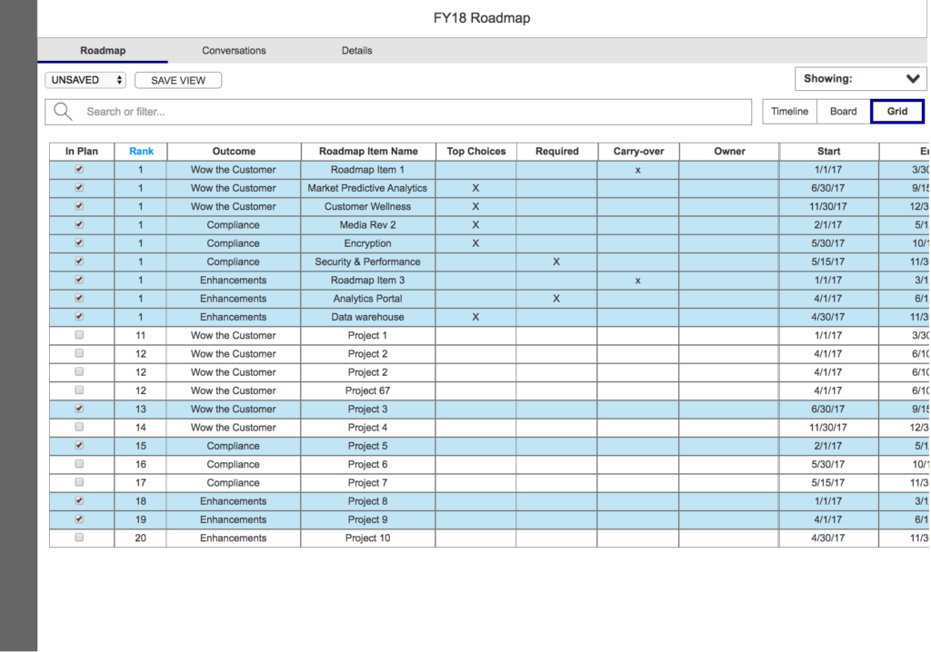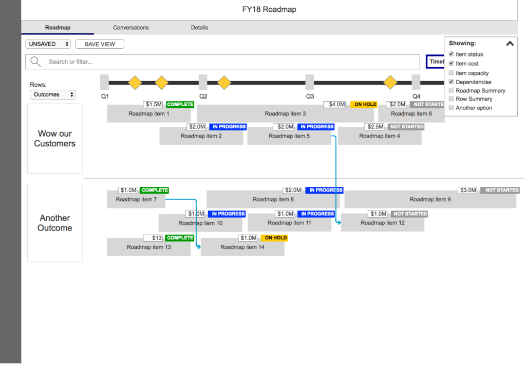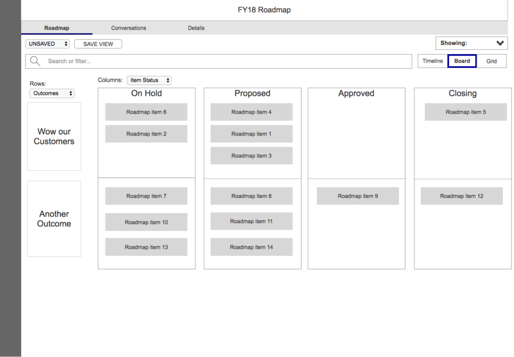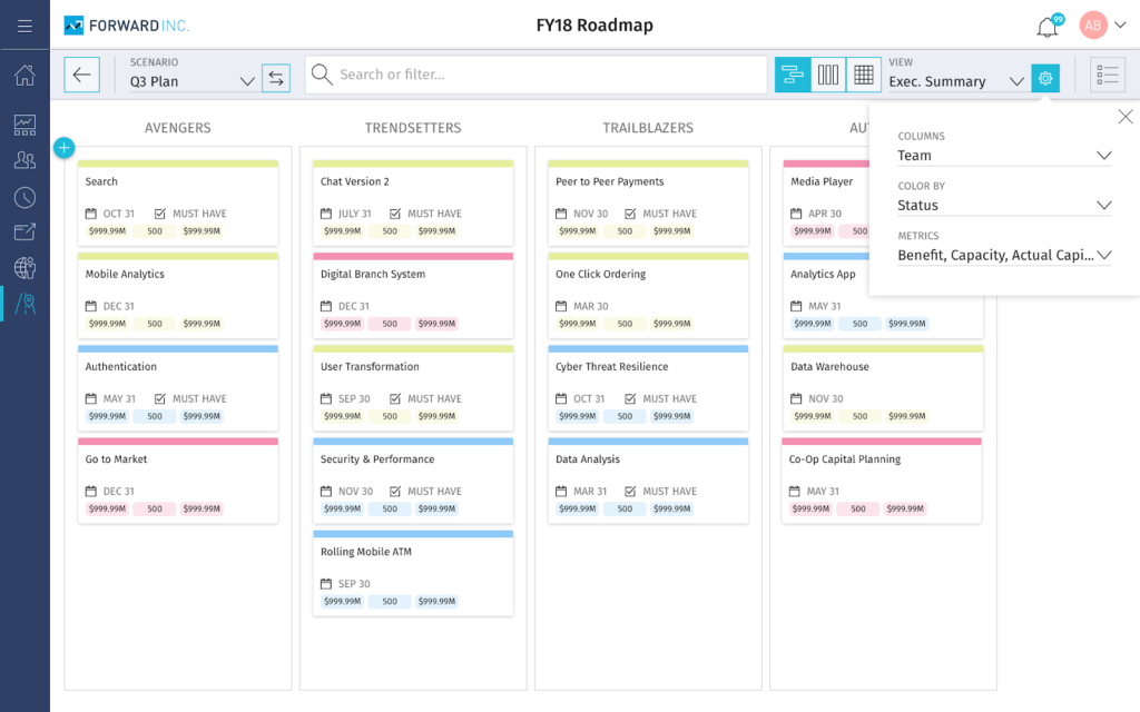During this project, my team met with stakeholders daily and we would meet as a UX team in the afternoons. Together, we came up with features like Saved Views, Dependencies and Scenarios. Possibly the biggest user benefits this module provided were the Timeline, Board and Grid views. This three-way toggle view helped users visually interpret, pivot and configure the same attribute data behind the scenes in different ways – a very powerful tool.