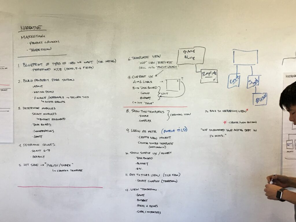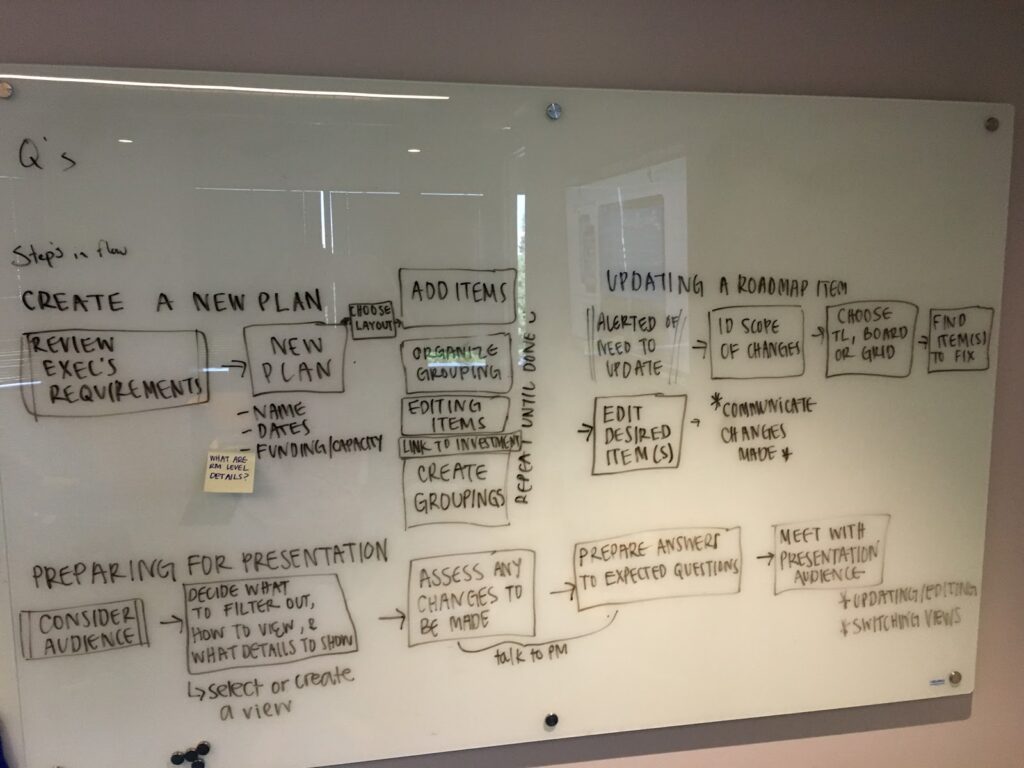 Roadmapping is a shared view that clearly communicates project planning and status used by different divisions. During initial research it became clear the Roadmapping was going to be a heavily-used module. PM and UX identified five key customers in various sectors for research. UX led the contextual inquiries to understand the customers’ planning process as well as what was and wasn’t working for them. From these meetings, my team started to lay out initial user flow and high-level needs/wants. During some contextual inquiries, we found customers sharing pictures of sticky notes and affinity diagrams from past meetings. Most often, users would show us spreadsheets that had no version control and often led to communication breakdown and confusion.