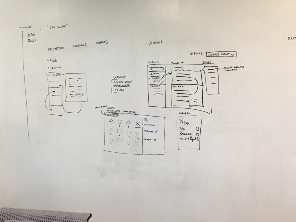 To start the redesign of the Admin module, my team met with three customer Admins for initial contextual interviews and then kicked off a three-day design sprint to move quickly. Here you can see the detail page and module screen come to life during the sprint: