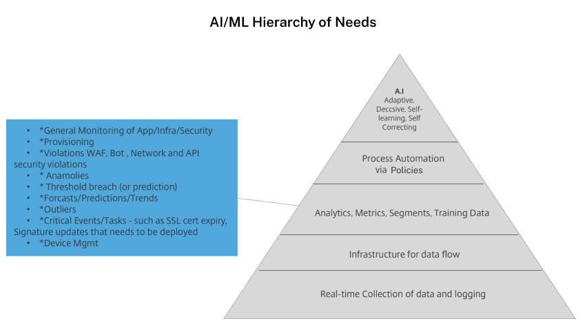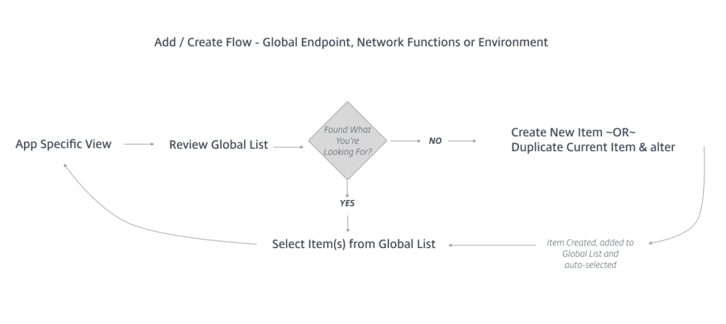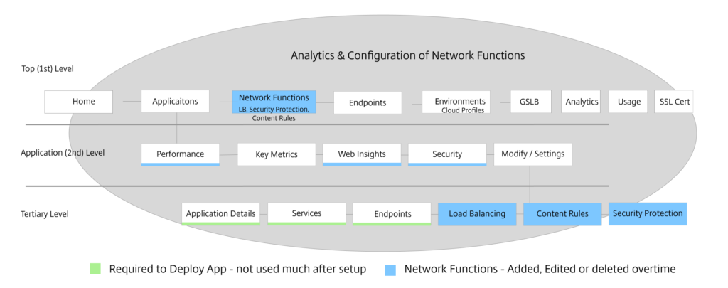 The diagram below shows where the team initially aligned on the design of the IA. After interviewing administrators who were familiar with ADS and addressing their workflows, we were able to iterate and elevate the most important features. Network functions (NF) were the initial building blocks to create the ML models and AI feedback system. NF were reusable across any application and the analytics are shown in many primary and secondary views. Giving the administrator one centralized location to change the NF was a way to streamline their workload.